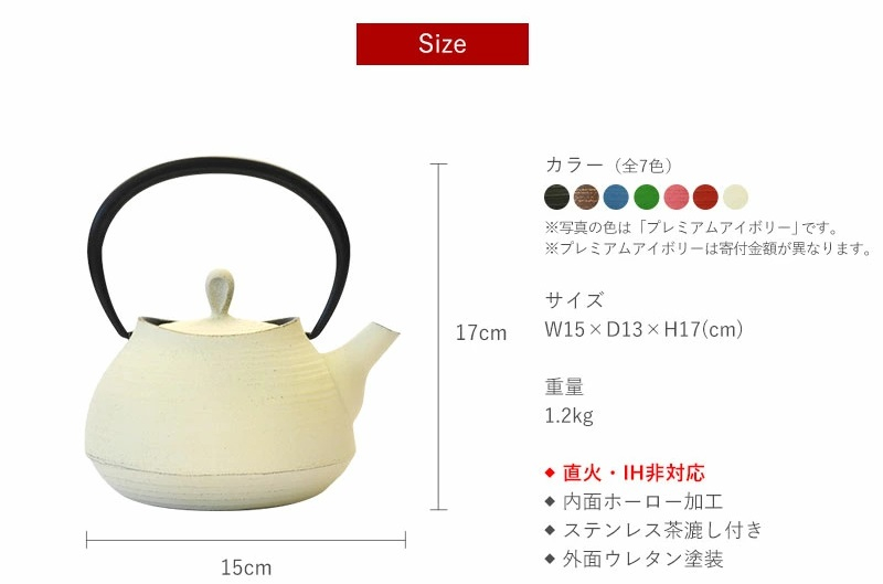 | 容量 | カラー:プレミアムアイボリー サイズ:W15×D13×H17cm重量:1.2kg材質:鋳鉄内面ホーロー加工、ステンレス茶漉し付き ■ご確認下さい■ ※直火とIHには非対応です。 ※持ち手は可動式です。 ※お使いになる前に必ず取扱説明書をご覧ください。 ※鋳物のため制作工程の都合上、大きさや重量は表記と若干誤差がある場合がございます。 ※内面にホーロー加工を施しているため、鉄分は溶出しません。(こちらの商品で鉄分補給はできません。鉄分補給には鉄瓶またはオーブンパン、カプセルクッカーをお勧めいたします) ※お客様がお使いのパソコン、スマートフォンなどのモニターの発色具合により、実際のものと色味が異なる場合がございます。稀に塗装ムラや筋、凸凹、小さな穴(のようなもの)などがありますが、作業工程上の痕ですので品質を損なうものではございません。鉄器ならではの風合いとしてご了承下さい。 地場産品類型 【3号】(平成31年総務省告示第179号第5条)盛岡市内において実施する工程により、半分以上の付加価値が生じている。 |