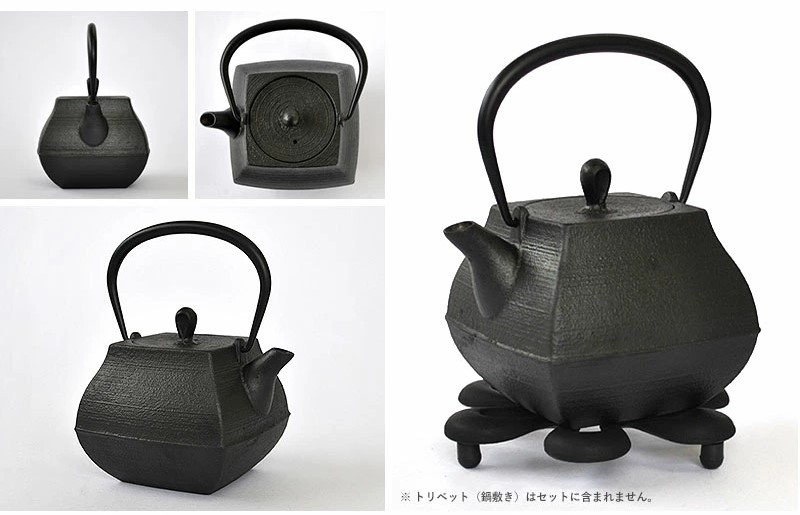 珍しい四角形状の鉄瓶です。四角形は制作が難しく、非常に高い技術を要します。