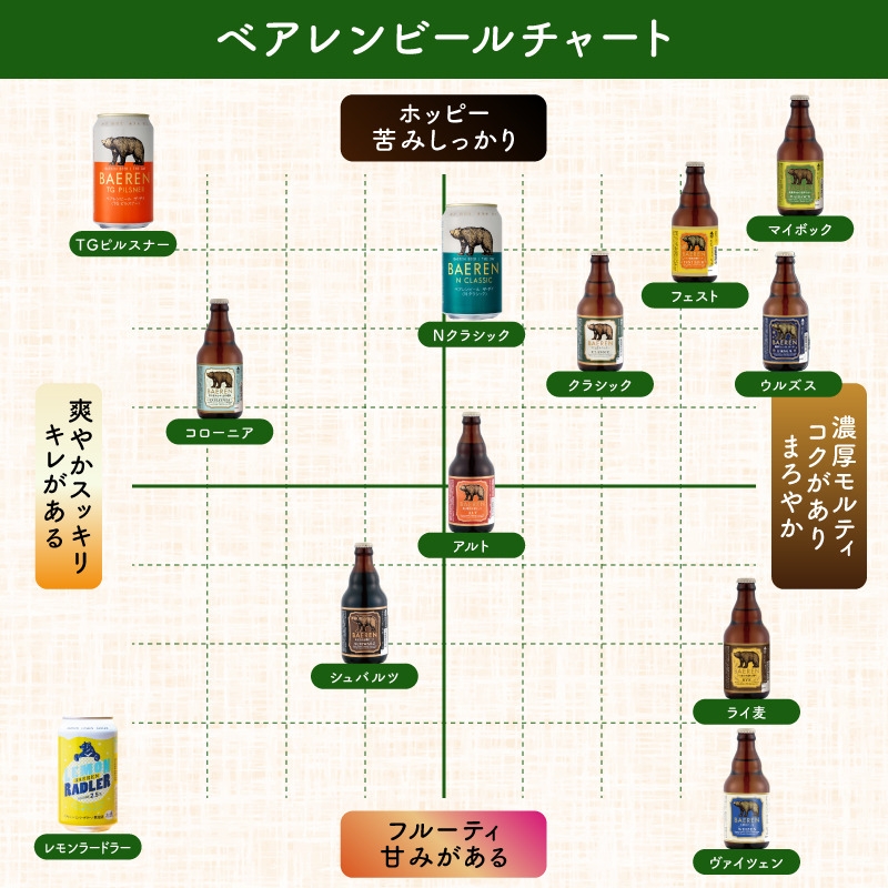 2~3種類以上の「缶ビール350ml×6本&瓶ビール330ml×6本」が詰め合わせになった飲み比べセットです。 ※6ヶ月の定期便となります。 私たちは、ヨーロッパの伝統的なビール文化を尊重し、手づくりの本格ビールを通して ビールにも選ぶ楽しみを提案します。食卓がもっと豊かに、ハッピーなものになるよう、 地元岩手よりビール文化を発信していきます。 ベアレン醸造所スタッフ一同 ベアレンでは南ドイツで実際に使われていた100年以上前の仕込み釜で造る瓶ビールと、 最新の設備を駆使しながらも伝統的な製法を取り入れた個性豊かな缶ビールを、 岩手山を望む2つの工場で製造しています。 日本でも数人しか資格を持つものがいない本場ドイツの国家資格 「ブラウマイスター」の称号を持つ醸造長のもと、本格ビールを製造しています。 ■ビールについて ・ラガービール 日本で飲まれるビールの多くは「ラガービール」と分類される種類です。 ラガービールはビールの種類の中でも低温で、時間をかけて発酵させる製法です。 ホップの苦みが効いた爽快なのどごしや、比較的スッキリとした味わいが特徴です。 ベアレンでは日本人に馴染み深い味わいのラガービールを得意としています。 いつも飲んでいる味だから誤魔化しがきかない。 いつも飲んでいるビールだけど、いつもと違うプレミアムな味わい。 馴染み深い味だからこそ、違いの分かるおいしさをお届けいたします。 ・エールビール 日本ではクラフトビールで造られることも多い「エールビール」。 エールビールに使用される酵母は、ラガー酵母が15世紀に発見されるより前から存在し、 それまではビールといえばエールが主流でした。 ラガーと違い常温で短期間発酵させ、複雑な香りと深いコク、フルーティーな味を楽しむことができます。 エールビールは日本人へは少し馴染みのない味わいかもしれません。 だからこそ、楽しめる新しいビールとの出会いを、 ベアレンはヨーロッパの伝統的な製法を用いて造るプレミアムな味わいでお届けいたします。 ※画像はイメージです。 ※20歳未満の飲酒は法律で禁止されています。