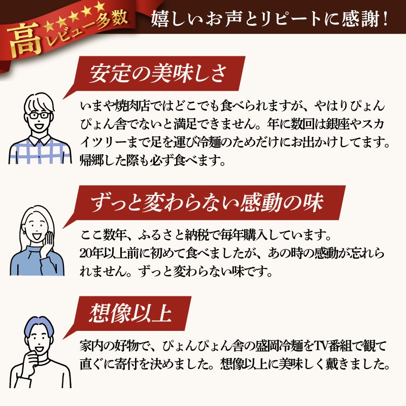 【配送不可:離島】 ■トッピングまで揃ったスペシャルセットが登場!本場の味を、手軽にご家庭で。 地元でダントツ!の人気・名店 「焼肉冷麺 ぴょんぴょん舎」 の盛岡冷麺。 その味をそのままご家庭で楽しめるように、トッピング(キムチ、ゆで卵、甘酢きゅうり、牛味付肉、酢、 ごま)が付いた本格生タイプの盛岡冷麵4食詰合せです。 盛岡冷麺の名付け親「ぴょんぴょん舎」から盛岡冷麺は全国に広まりました。 ■独特のコシと弾力を持つ本格生麺 モチモチとした食感が特徴の特製麺は、冷水で締めることでさらにコシが際立ちます。 ■牛骨ベースの濃厚スープ 旨みたっぷりのストレートスープは、冷麺の味を引き立てるコク深い味わい。 ■専用キムチの絶妙なバランス 辛すぎず、酸味と甘みのバランスが絶妙。全体の味を引き締め、食欲をそそります。 ■作り置きなしの新鮮製造 お店で提供している味をそのまま再現。注文後に製造・出荷いたします。 いつでも新鮮な状態でお届けします。 ※ご注文を受けてから製造し、出荷するためお届けまでにお時間を頂戴いたします。(クール便でお届けいたします。贈答用の包装はお受けできません。) ※掲載の「お礼の品」は品切れや季節の都合で受付を終了・中止していることがあります。 ◆こんな方におすすめ 本場・盛岡の味をご家庭でも簡単に手軽に楽しみたい方 トッピング4食分付き : キムチ、ゆで卵、甘酢きゅうり、牛味付肉、酢、 ごま 冷麺・麺類が大好きな方 夏の贈り物やお中元を探している方 ふるさと納税で“間違いない”返礼品を選びたい方 ※画像はイメージです。 ※離島への配送はできかねますので、あらかじめご了承願います。 ※上記のエリアからの申し込みは返礼品の手配が出来ないため、「キャンセル」または「寄附のみ」とさせていただきます。予めご了承ください。 ※ご注文を受けてから製造し、出荷するためお届けまでにお時間を頂戴いたします。(クール便でお届けいたします。贈答用の包装はお受けできません。)