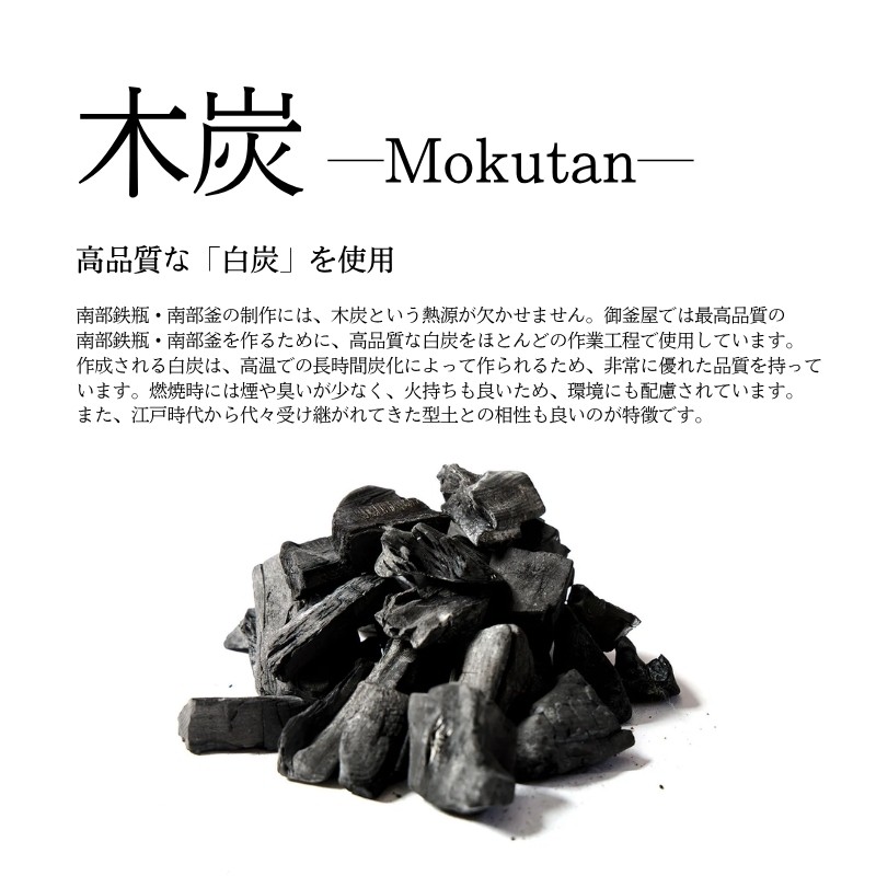 ・木炭(雫石の白炭): 岩手県雫石町産の白炭は、煙や臭いが少なく火持ちが良いため、作業環境に配慮されています。