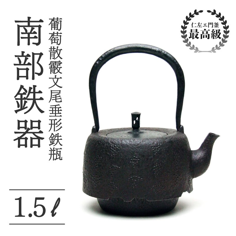 葡萄散霰文尾垂形鉄瓶 1.5L 南部鉄器 鉄瓶 やかん 急須 伝統工芸品 最高級品 プレゼント お茶 美味しい 直火OK 錆びにくい 贈り物 ギフト 茶道具 逸品 芸術品 盛岡名産 日本製 国産 職人 手作り 仁左衛門釜 伝統技術 希少 高級 贈答用 岩手県 盛岡市 東北 岩手 盛岡 御釜屋