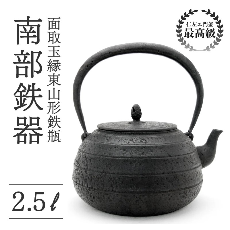 面取玉縁東山形鉄瓶 2.5L 仁左衛門釜 南部鉄器 鉄瓶 やかん 急須 伝統工芸品 最高級品 プレゼント 観賞用 砂鉄製 お茶 直火OK 錆びにくい 茶道具 一生もの 逸品 芸術品 贈り物 ギフト 贈答用 盛岡名産 日本製 国産 職人 手作り 本物 岩手県 盛岡市 東北 岩手 盛岡 御釜屋