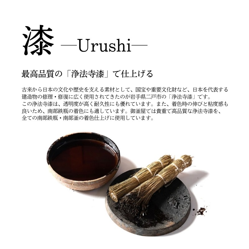 ・漆(浄法寺漆): 岩手県二戸市産の浄法寺漆は、透明度が高く耐久性に優れ、南部鉄瓶の着色に最適です。