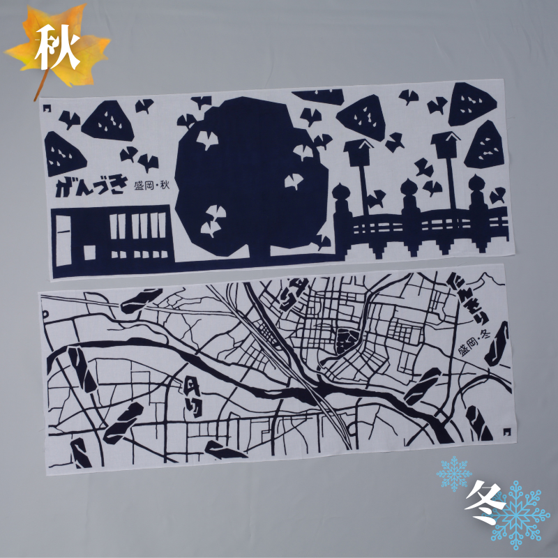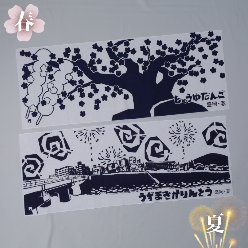 盛岡の四季とともに、伝統菓子を紹介しています。盛岡ゆかりの若いデザイナーがデザインし、盛岡で100年以上続く染物屋さんである巴染工株式会社様に染めて頂きました。商品には、それぞれ、菓子をイメージして頂けるよう、菓子についての簡単な説明を掲載しています。