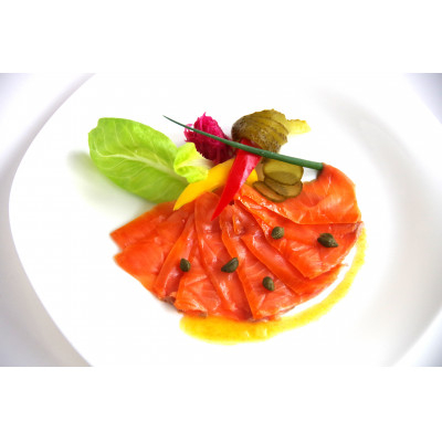 栄養豊富な宮古の海で育てられた、脂ノリの良いトラウトサーモンを、白樺揺れる冬の高原(宮古市川井区界)で製造します。紅葉樹のチップを使い、低温でじっくりと燻しました。