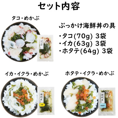 メカブ・イクラ入り!川秀のぶっかけ海鮮丼の具(イカ・ホタテ・タコ)計9袋冷凍セット 岩手県宮古市【1634986】