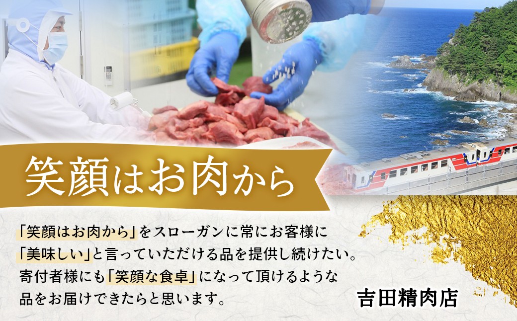 厚切り牛タンを、自然豊かな三陸の海でとれた塩と昆布で作った塩だれで味付けしました。 吉田精肉店と言えば「手仕込みの味付け」。両面に入れた切り込みが塩だれを全体に浸透させ、柔らかく旨味たっぷりな品となります。 ※本お礼品にはタン先が含まれます。 ■生産者の声 吉田精肉店の製品は皆様にご満足いただけるよう徹底した衛生管理の下、こだわりをもって生産しております。 何度も試作し、試行錯誤の上、製品化しておりますので、ぜひご賞味ください。 ■注意事項/その他 本お礼品は冷凍でのお届けとなります。お召し上がりの際は、前夜から冷蔵庫内で解凍していただくことをお勧めします。この方法ですと、時間はかかりますが、肉の旨味成分の流出が抑えられ、より美味しくお召し上がりいただけます。 お届け直後は特に美味しく味わっていただけますので、早めの調理をお奨めいたします。残った商品の再凍結はお勧めいたしません。宮古市で行っている製造加工工程:原料受け入れ、解凍、皮むき・成形(皮むき、汚れ、脂肪、血合いの除去)、タンブリング(味付け)、スライス・切れ目入れ(重量確認)、味付け、熟成(真空包装の上24時間熟成)、計量、真空個包装、異物検査(X線、金属探知)、梱包、冷凍保管、出荷