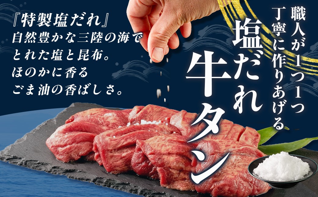 厚切り牛タンを、自然豊かな三陸の海でとれた塩と昆布で作った塩だれで味付けしました。 吉田精肉店と言えば「手仕込みの味付け」。両面に入れた切り込みが塩だれを全体に浸透させ、柔らかく旨味たっぷりな品となります。 ※本お礼品にはタン先が含まれます。 ■生産者の声 吉田精肉店の製品は皆様にご満足いただけるよう徹底した衛生管理の下、こだわりをもって生産しております。 何度も試作し、試行錯誤の上、製品化しておりますので、ぜひご賞味ください。 ■注意事項/その他 本お礼品は冷凍でのお届けとなります。お召し上がりの際は、前夜から冷蔵庫内で解凍していただくことをお勧めします。この方法ですと、時間はかかりますが、肉の旨味成分の流出が抑えられ、より美味しくお召し上がりいただけます。 お届け直後は特に美味しく味わっていただけますので、早めの調理をお奨めいたします。残った商品の再凍結はお勧めいたしません。