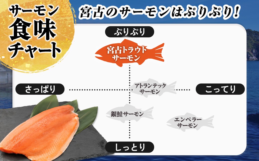 新鮮な岩手県宮古市産トラウトサーモンを三枚卸にし、急速凍結で旨味を閉じ込めました。