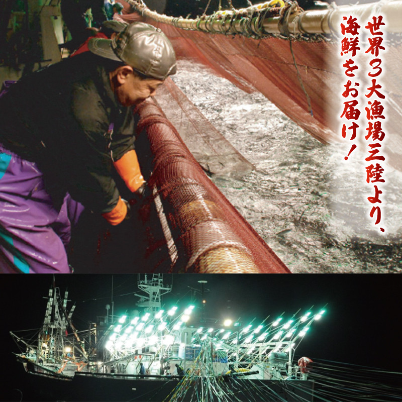 ホタテ、サンマを中心とする三陸の魚介類(ホタテ、サンマ、カキ、カツオ、サケ、イカ、ワカメなど)を供給しつづけています。