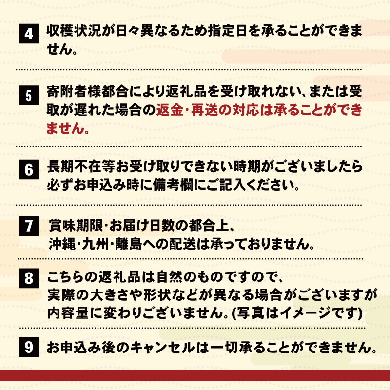 ※天候や漁獲状況などにより前後する可能性があります ※沖縄・離島への配送はできません。 【お願い・ご確認ください】 大変恐れ入りますが、 季節品のため「配送日時指定(◯曜日着希望、◯日着希望 等)」や、「納品日のお問い合わせ(発送日の事前連絡 等)」は承っておりません。注文順に順次出荷いたします。 予めご了承いただいたうえお申し込みをお願いいたします。 |