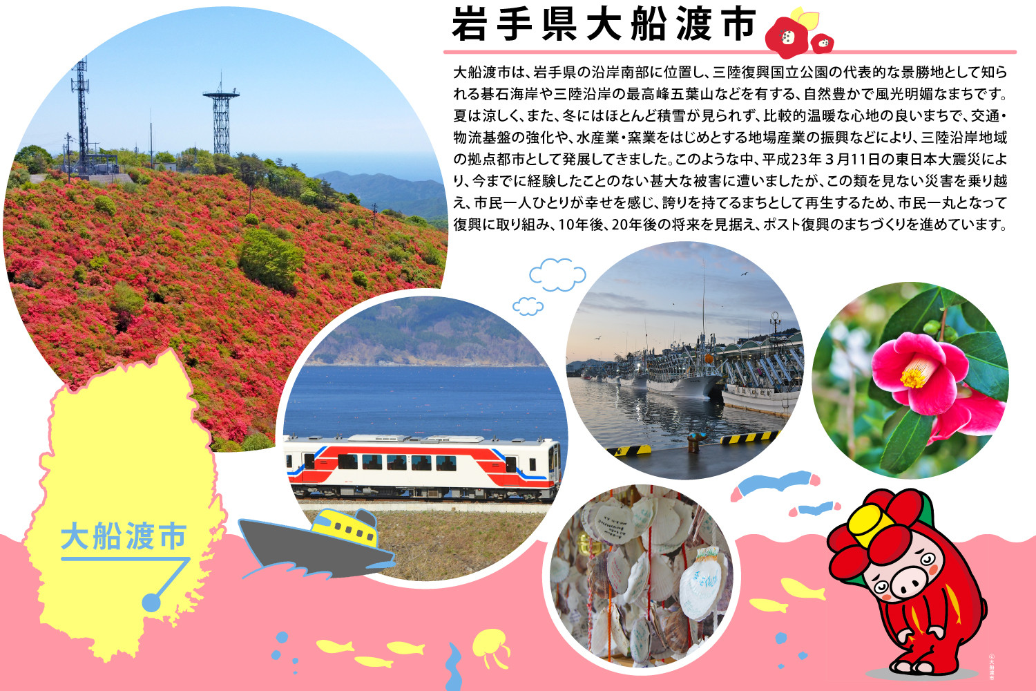 大船渡市は、岩手県の沿岸南部に位置し、三陸復興国立公園の代表的な景勝地として知られる碁石海岸や三陸沿岸の最高峰五葉山などを有する、自然豊かで風光明媚なまちです。