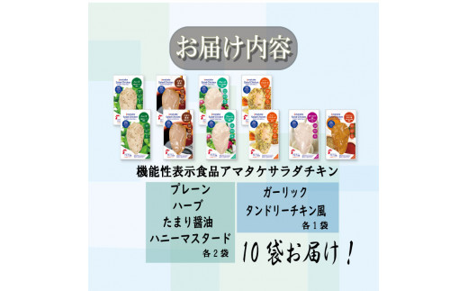 容量 | アマタケサラダチキン(ハーブ、たまり醤油、プレーン、ハニーマスタード)各2袋 アマタケサラダチキン(ガーリック、タンドリーチキン風)各1袋 計10袋 |