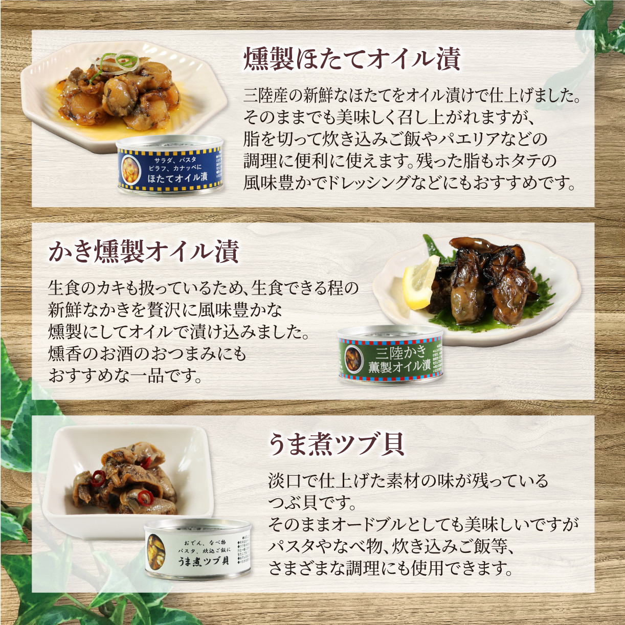 缶詰3種セット ( 燻製ほたてオイル漬 / かき燻製オイル漬 / うま煮つぶ貝 ) 各3個 計9個