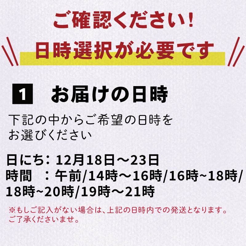 | 発送期日 | 12/18~12/23 ※指定日時必須 ※お荷物が集中する時期や天候などの影響により遅延する場合や、解凍に一晩必要ですので、余裕をもった日にち指定をおすすめいたします |