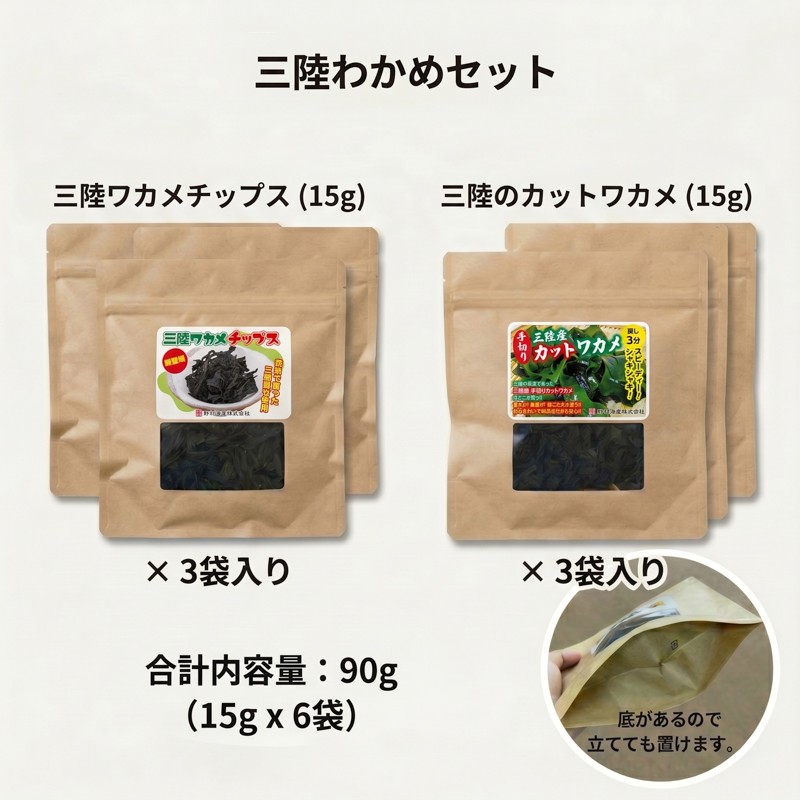 | 容量 | 計6袋(各3袋) カットわかめ:15g×3袋 わかめチップス:15g×3袋 |