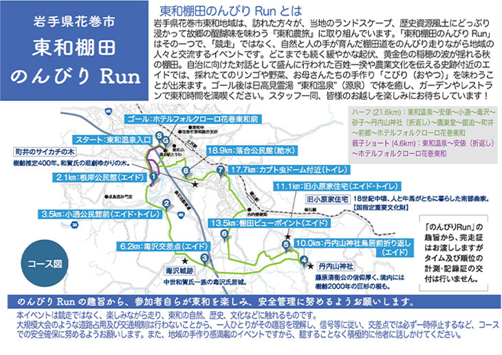 大会運営、詳細については「東和棚田のんびりRun」フェイスブックページをご覧いただくか、