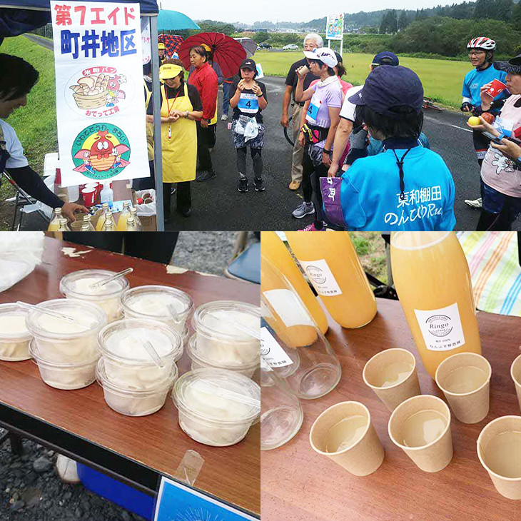 エイドでは、東和自慢の穫れたてリンゴや地元のお母さんたちの手作りの「こびり(おやつ)」を味わえます。