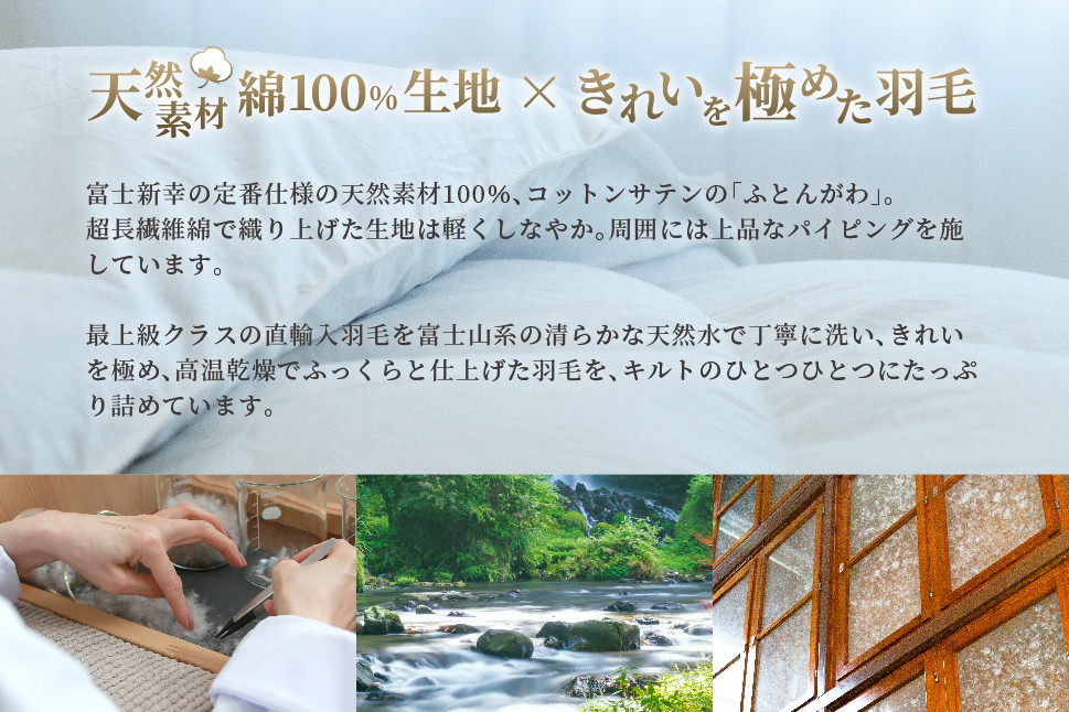 富士山系の清らかな天然水で丁寧に洗い、きれいを極め、高温乾燥でふっくらと仕上げた羽毛を、キルトのひとつひとつにふんわり詰めています。