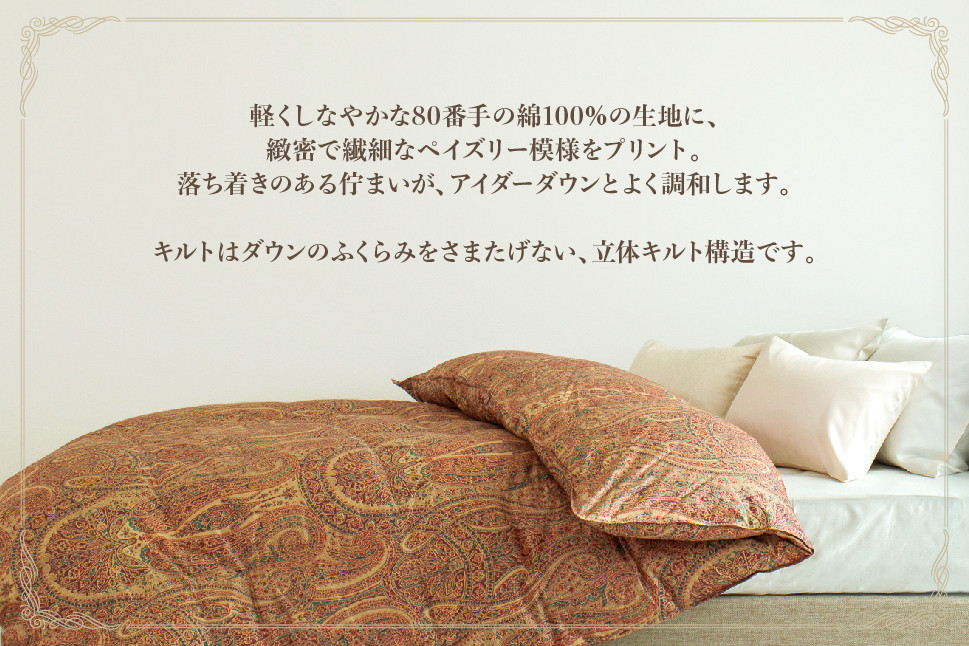 アイダー羽毛ふとん「ウォルター」は、軽くしなやかな80番手の綿100%の生地に、緻密で繊細なペイズリー模様をプリント。落ち着きのある佇まいが、アイダーダウンとよく調和します。ダウンのふくらみをさまたげない、立体キルト構造です。