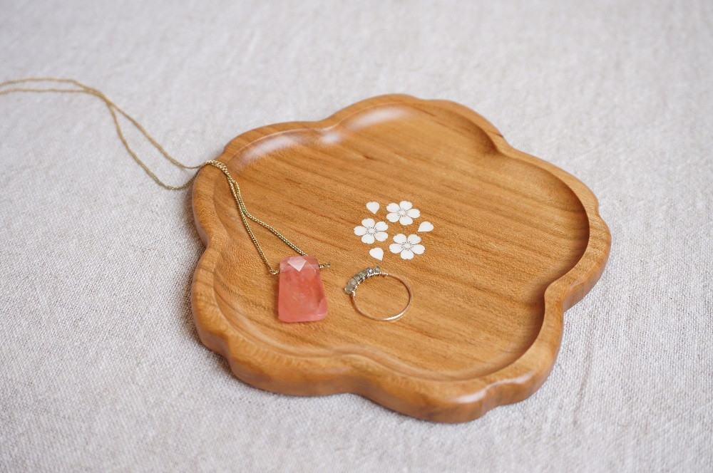 山桜の間伐材でつくられた桜の形の小さなトレー。アクセサリー用や銘々皿としても 【貝象嵌】 さくらトレー