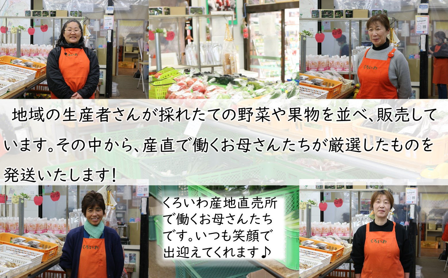 東には北上山地、西には大河を要する黒岩の地で育まれた野菜を中心に産直で働くお母さんたちの目利きにより選ばれた野菜が入ります。
