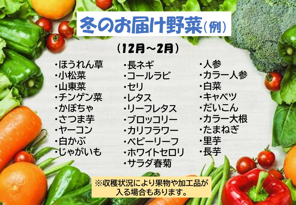 | 容量 | 旬の野菜7品 ※季節によって果物・加工品が入る場合があります (納豆・味噌・漬物など) |