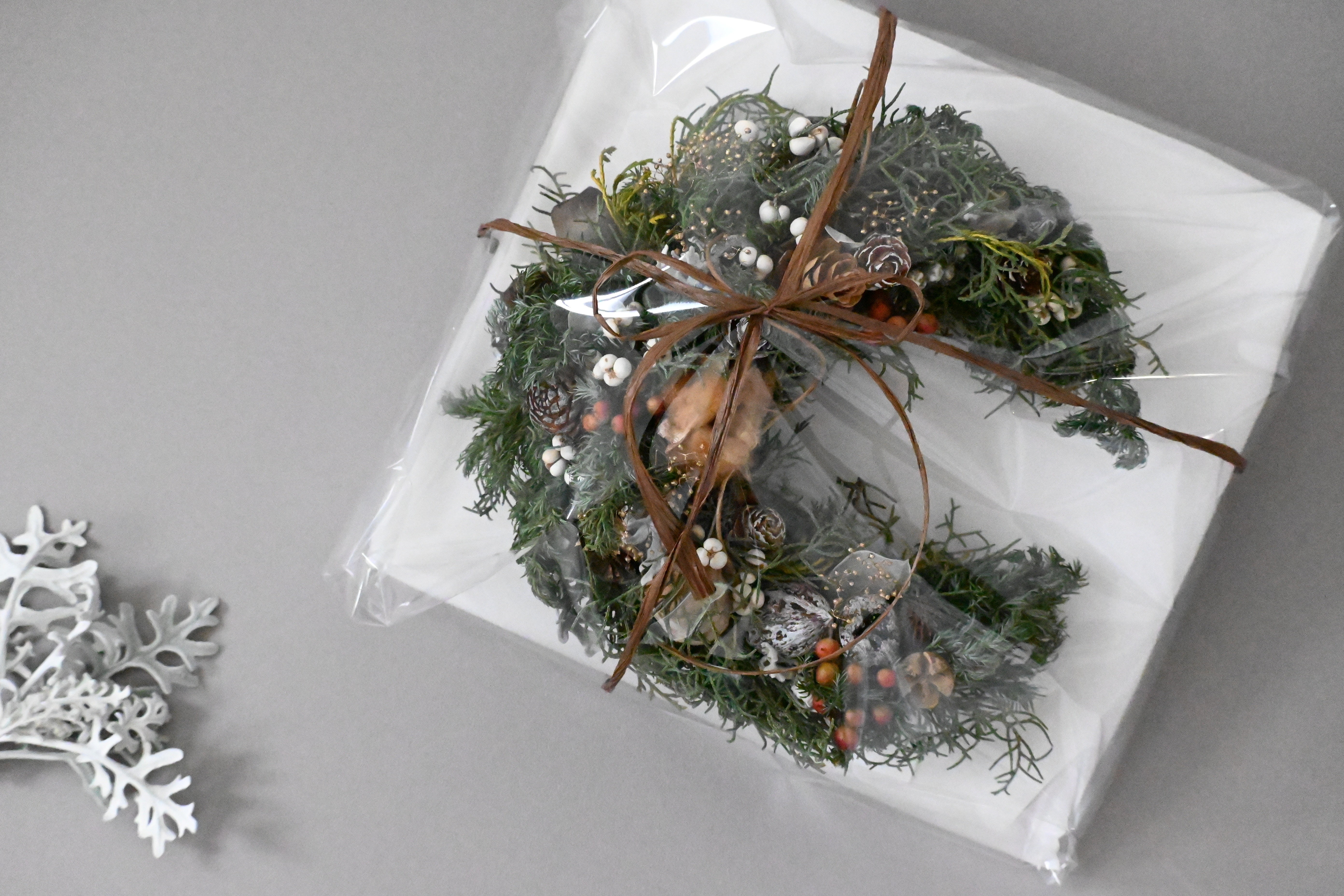 スワッグやリースなど、まだ完全にドライになっていないアレンジメントは、蒸れを防ぐためラッピングの下部を開けた状態でお包みしています。