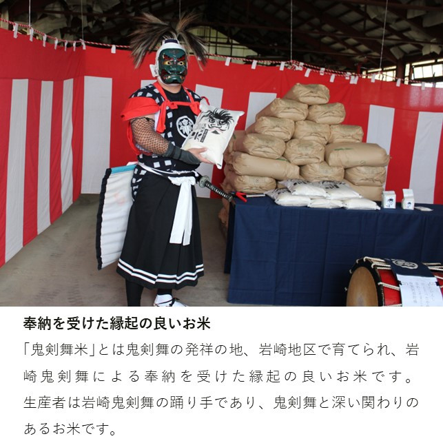 「鬼剣舞米」とは鬼剣舞の発祥の地、岩崎地区で育てられ、岩崎鬼剣舞による奉納を受けた縁起の良いお米です。