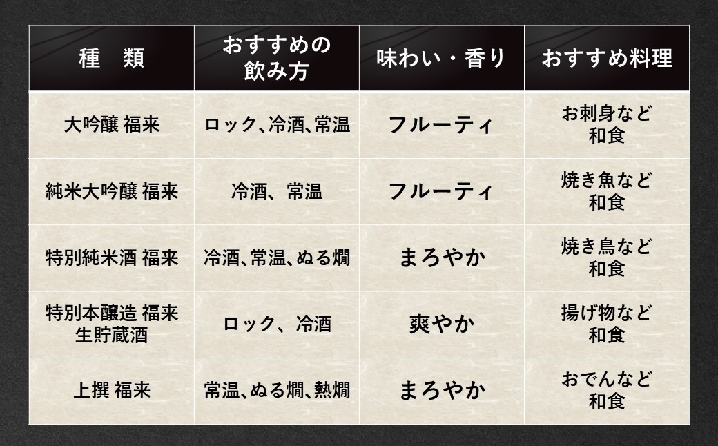 | 容量 | 大吟醸 福来 300ml 純米大吟醸 福来 300ml 特別純米酒 300ml 特別本醸造 福来 生貯蔵酒 300ml 上撰 福来 300ml |