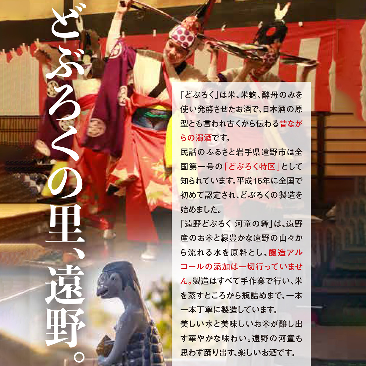 美しい水と美味しいお米が醸し出す華やかな味わい。遠野の河童も思わず踊り出す、楽しいお酒です。