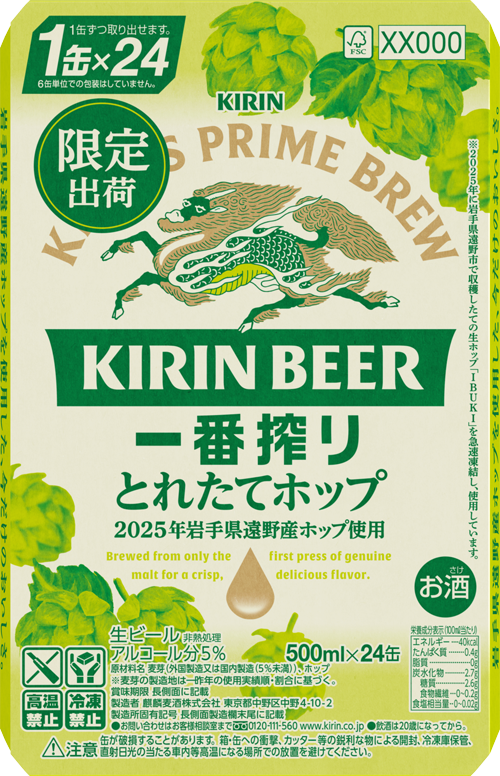 | 容量 | 一番搾りとれたてホップ生ビール 500ml × 24本 × 50ケース |