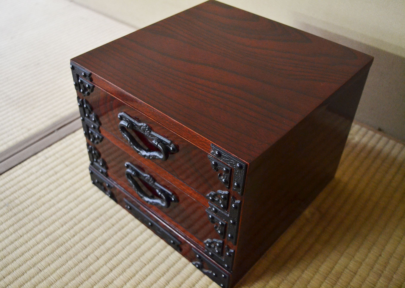 | 容量 | サイズ(mm):幅300×奥行300×高さ240 表面材:ケヤキ天然杢 内装材:南部桐 金具:南部鉄器 塗装:拭き漆塗り |