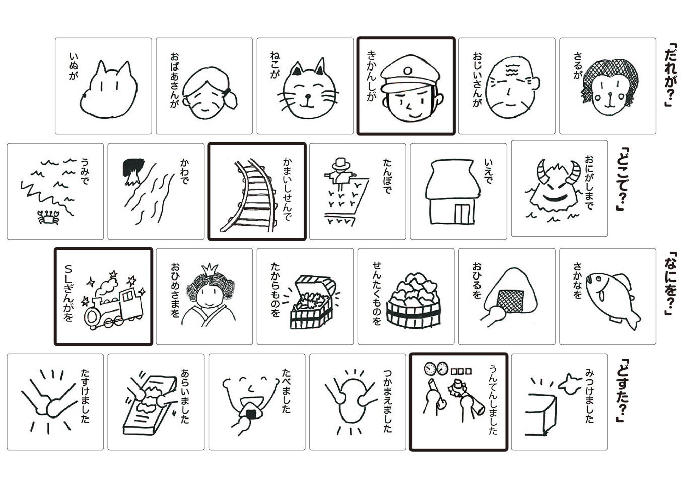 「だれが?」「どこで?」「なにを?」「どすた?(遠野弁でどうした?という意味)」と描かれた4個のキューブを組み合わせて、お話をつくります。