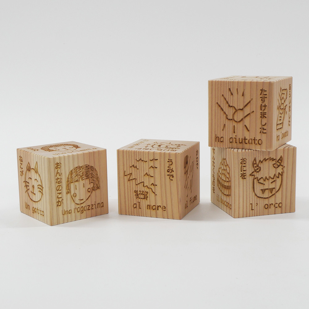 木の香り、手触りとともに五感を使って遊ぶ木育玩具です。4つのキューブを使ってイタリア語で昔話を楽しみましょう!