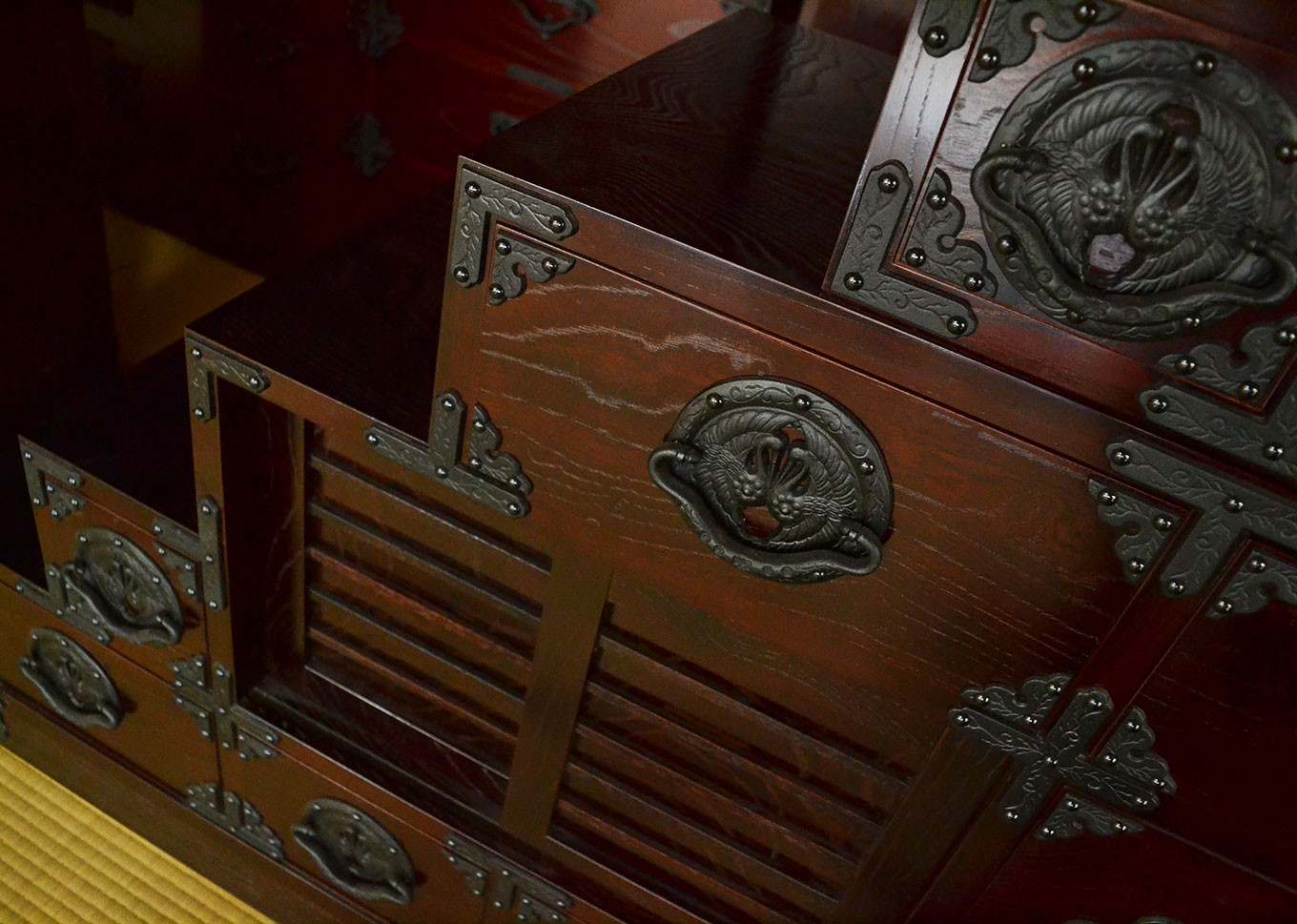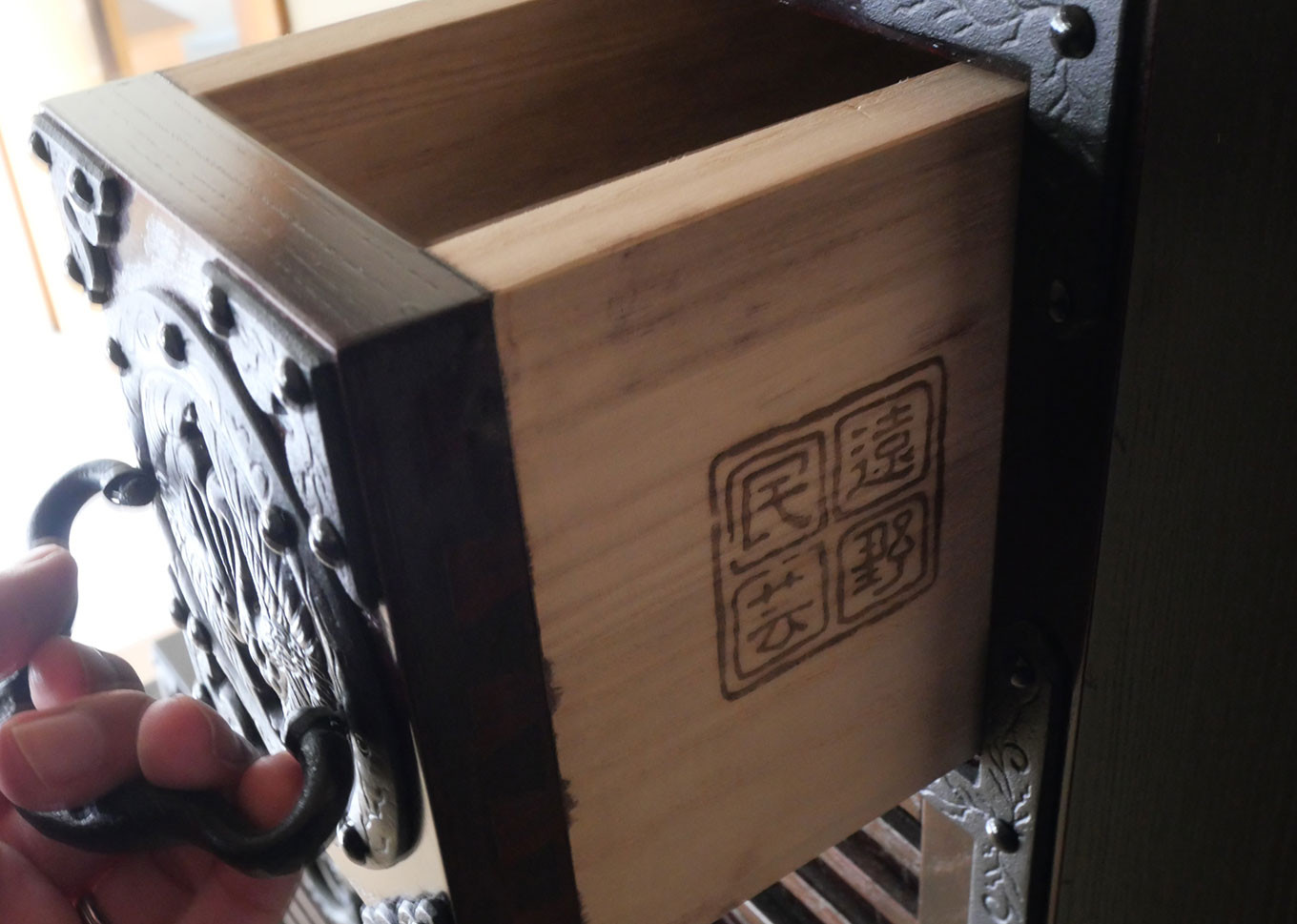 遠野民芸家具は、表面材には北上山地の樹齢500年以上のケヤキ天然杢、内装材には地元南部桐(主材)、金具は南部鉄器、塗装は漆塗りを用いています。