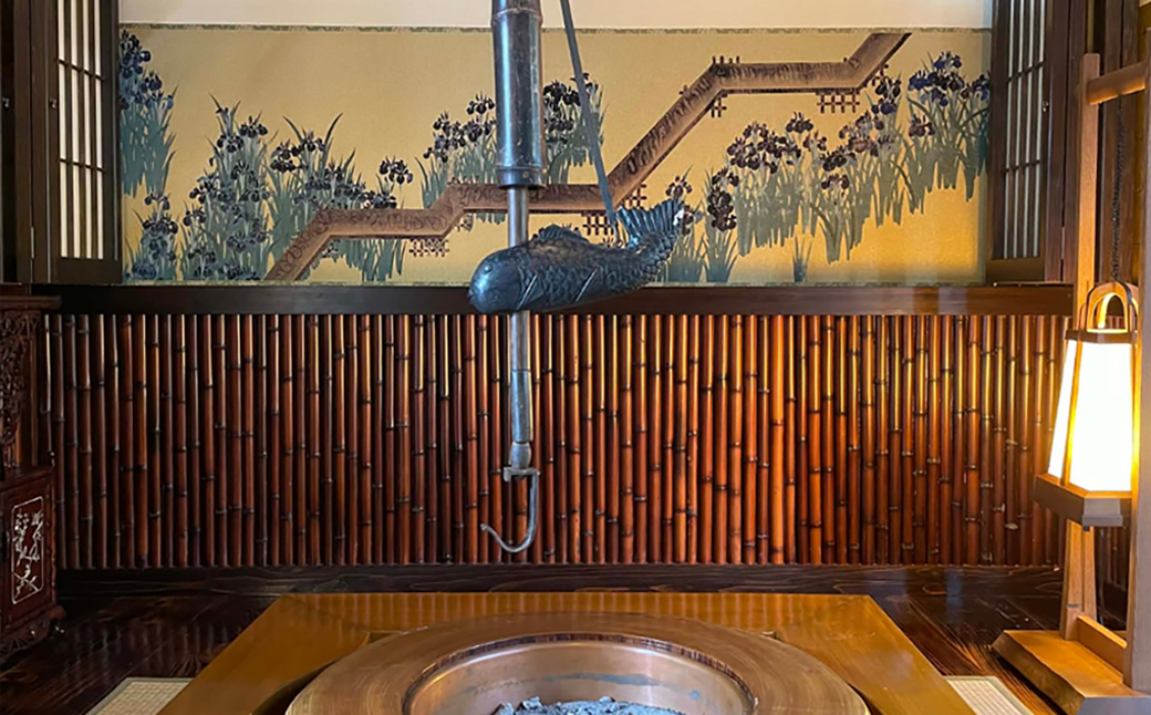 い草編みの円座が置かれた囲炉裏端で、心静かに癒やされる和の空間。天井から吊り下がる自在鉤や、温かな行燈の照明が、親しい人とのだんらんに、和やかな彩りを添えてくれます。