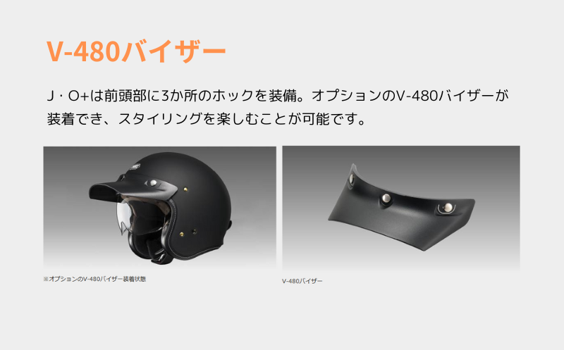※J・O+は前頭部に3か所のホックを装備。オプションのV-480バイザーが装着でき、スタイリングを楽しむことが可能