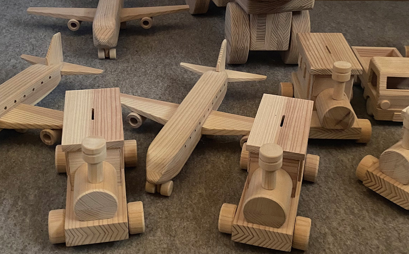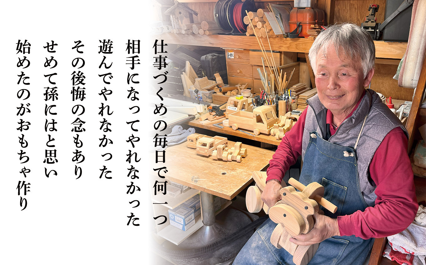 自分の息子には、仕事づくめの毎日で何一つ相手になってやれなかった。遊んでやれなかった。その後悔の念もあり、せめて孫にはと思い始めたのがおもちゃ作りのきっかけです。世の中にはプラスチックや合金などのおもちゃに溢れてるけど、やっぱり木のぬくもりを直接感じるおもちゃでも遊んで欲しいという思いで制作しております。