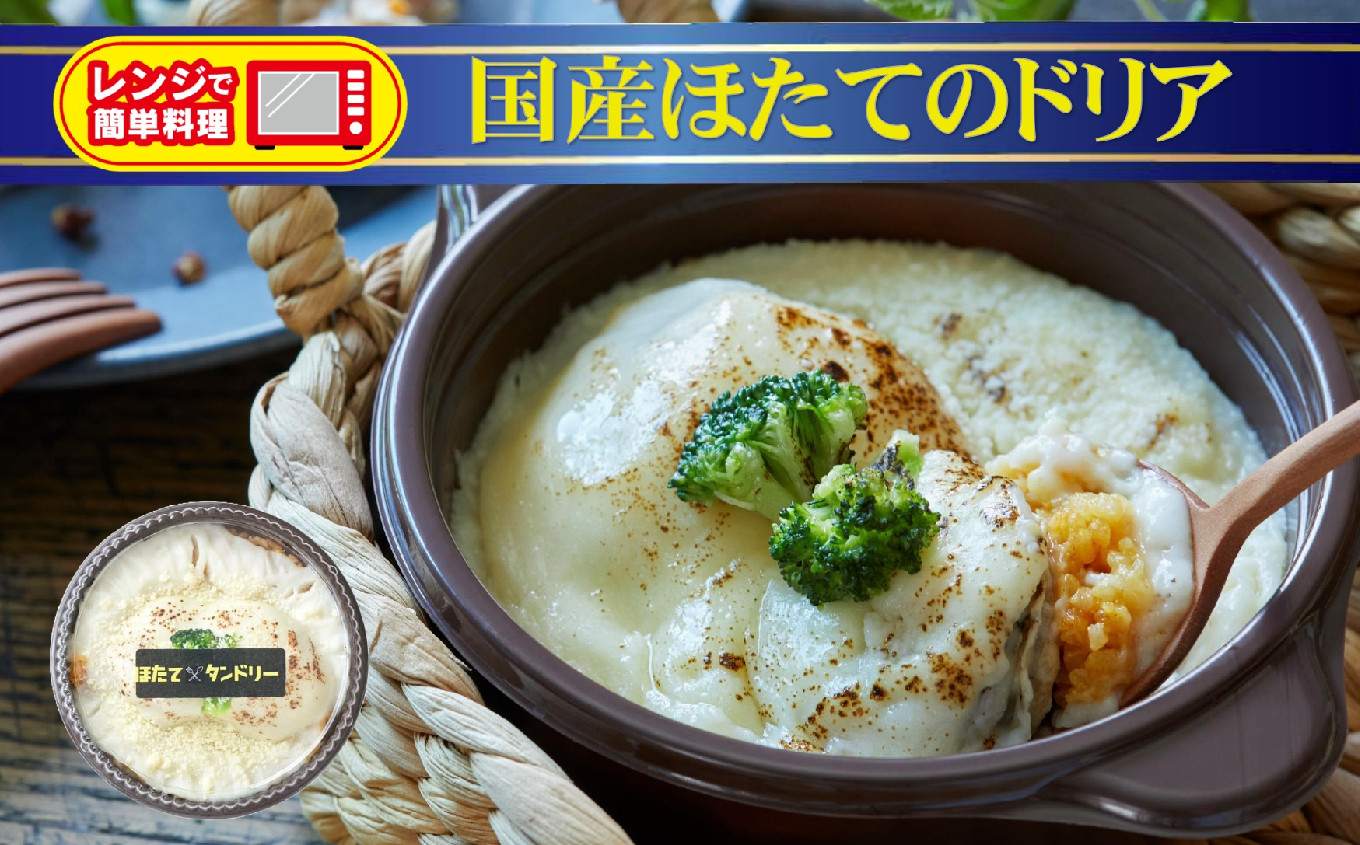 贅沢に丸ごと使用したホタテ×香辛料の香りが食欲をそそるタンドリーライスのドリアです。頑張った自分へのご褒美に、家族のお祝いに、あつあつごちそうドリアが食卓に笑顔をお届けします。おいしい海のごちそうと、相性バッチリなライス、濃厚なチーズソースのハーモニーをぜひお楽しみください。