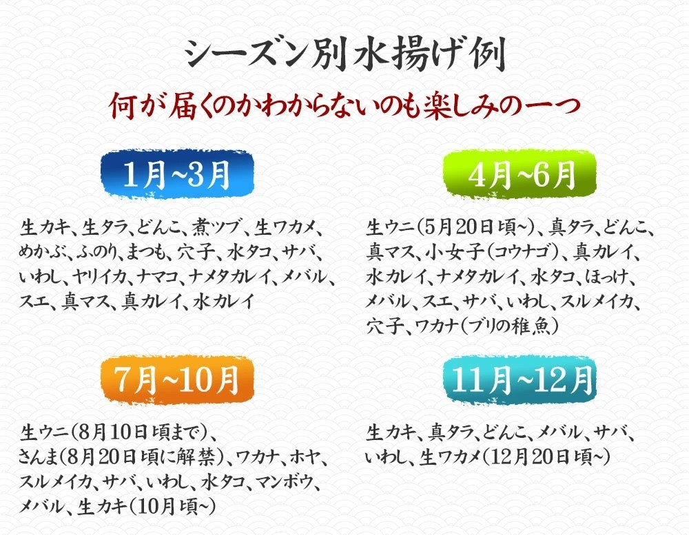 生牡蠣、真タラ、どんこ、煮つぶ、生わかめ、めかぶ、ふのり、まつも、穴子、水タコ、さば、いわし、ヤリイカ、なまこ、なめたかれい、めばる、スエ、真マス、真かれい、水かれい
