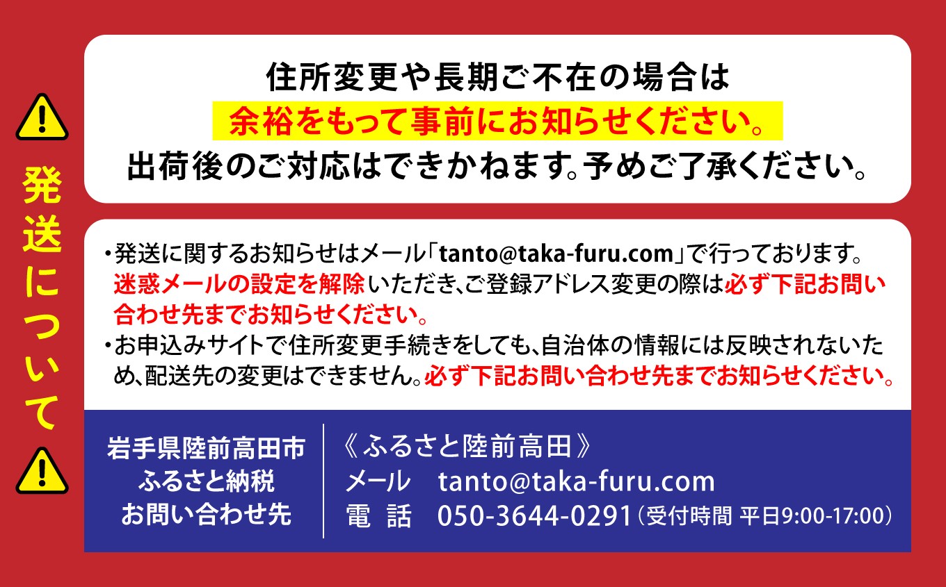 【先行予約】 2026年12月中旬頃から順次発送(お申込順の発送とさせていただきます) ※※ご確認ください※※ 1. 天候等により収穫時期が前後する場合がございますので、あらかじめご了承ください。 2. 事前に「不在日・受取不可日」の連絡がなく、長期不在等の寄附者様のご都合により受け取りが出来なかった場合については再送や返金は致しかねます。 3. 生鮮品のため、返礼品受取後すぐに状態をご確認ください。万が一ひどい傷み等があった場合は写真を添付の上、お問い合わせ窓口【ふるさと陸前高田】までご連絡をお願いいたします。なお、寄附者様都合でお受け取りまで時間がかかった場合の再送や返金は致しかねます。 4. 天候等により予定していた収量が見込めない場合、今シーズンお届けすることができず、翌シーズンまでお待ちいただく場合もございます。その場合は別途ご連絡をさせていただきます。 |