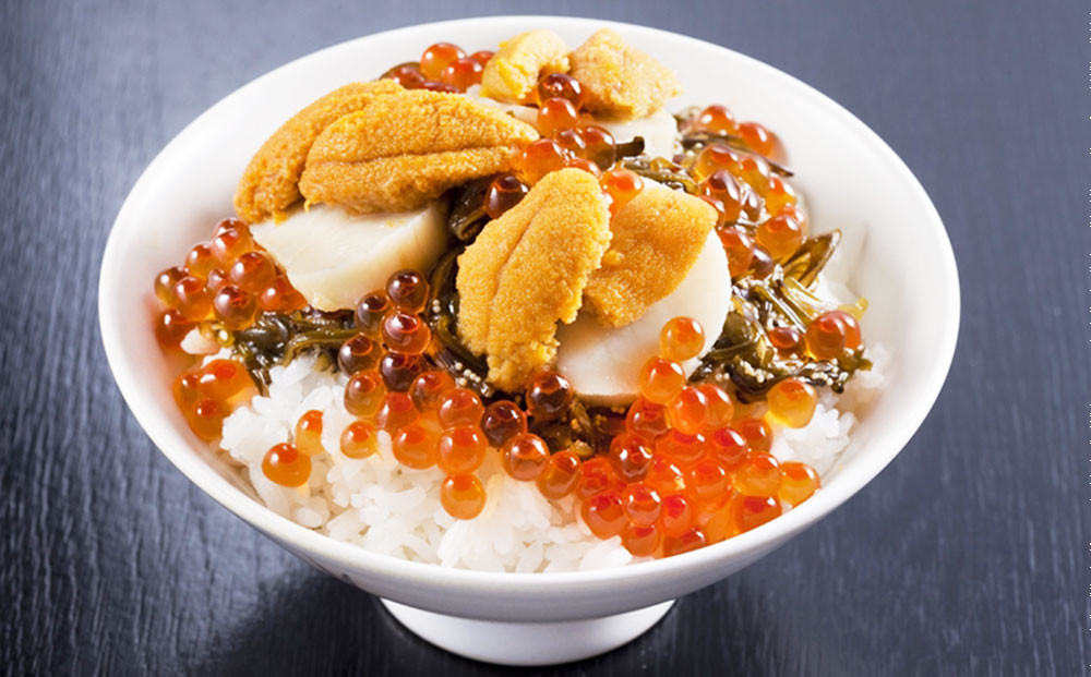 めかぶ醤油漬に、焼うに、酒蒸しほたて、濃厚いくらをトッピングしました。うには三陸産のキタムラサキウニを使用し、「海水焼き」にすることで旨味をギュッと閉じ込めています。炊きたての御飯にのせて食べていただきたい逸品です。