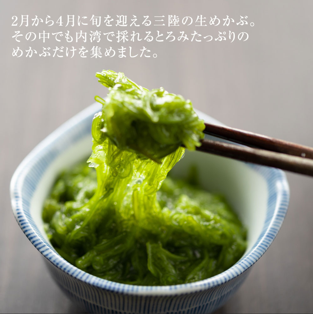 2月から4月に旬を迎える三陸の生めかぶ。その中でも内湾で採れるとろみたっぷりのめかぶだけを集めました。