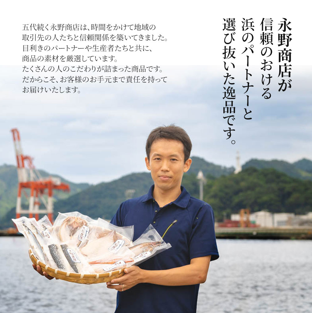 永野商店自慢の干物は、原料の品質・鮮度にこだわり、お魚本来の美味しさを引き出すように、甘塩に味付けをして、寒風干しでソフトに仕上げております。家族経営の小さなお店で、大手のように大量生産はできない体制ですが、一つ一つ手づくり・丹精込めた商品を作っております。どうぞこの機会にご利用くださいませ。
