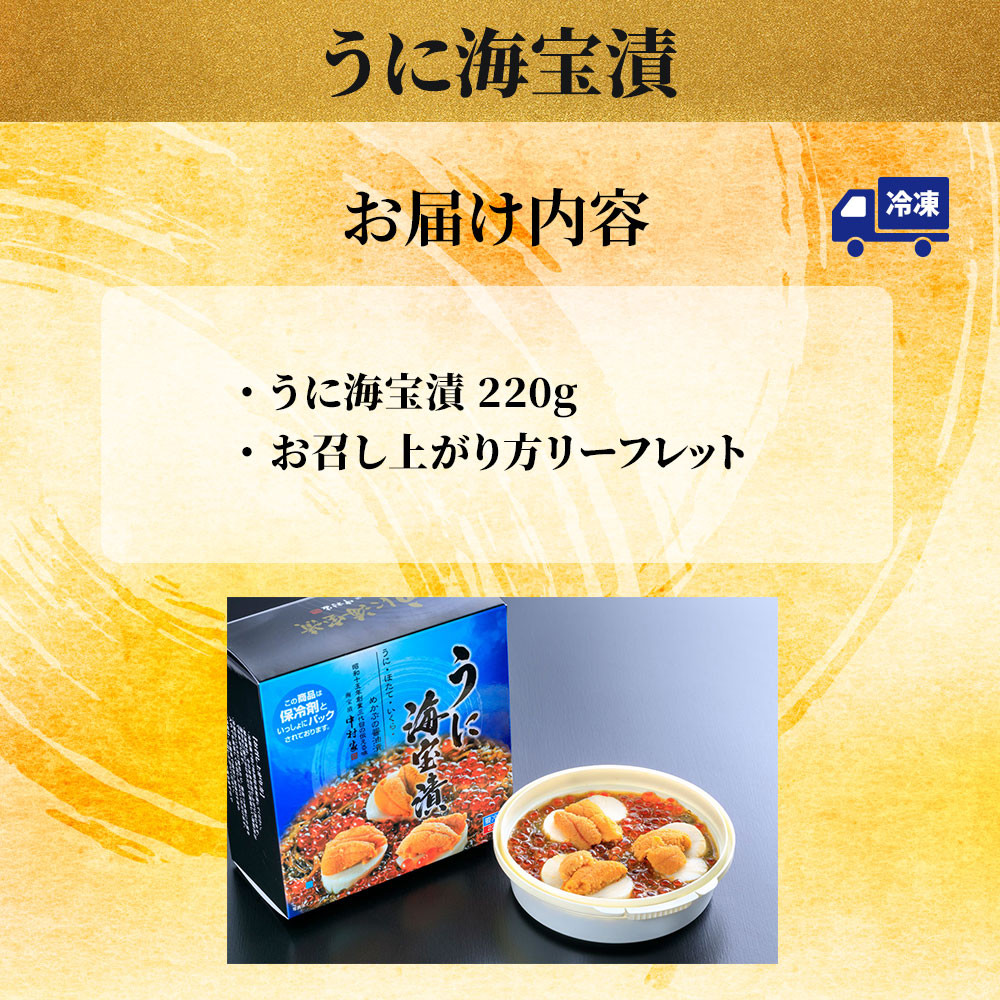 中村家の海宝漬の中でも常に人気を保っている「うに海宝漬」のお求めになりやすい220g版です。