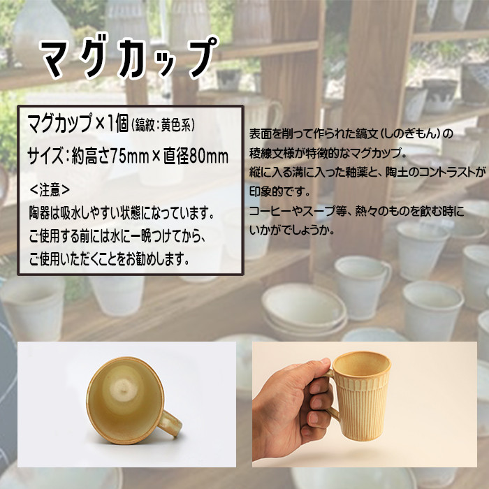 | 容量 | マグカップ×1個(鎬紋:黄色系) サイズ:約高さ75mm×直径80mm <ご使用の前に> 陶器は吸水しやすい状態になっています。 ご使用する前には水に一晩つけてから、ご使用いただくことをお勧めします。 |