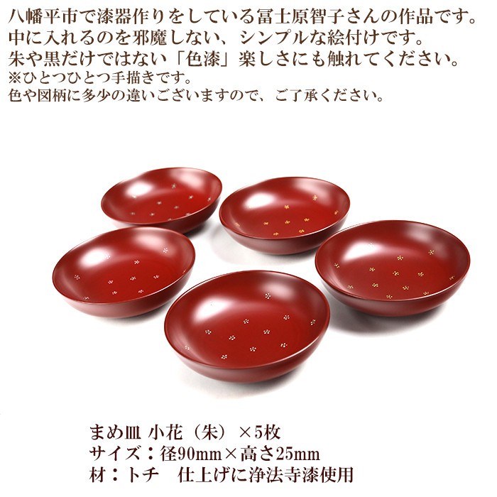 輝かしい受賞歴を持つ冨士原さんの作品をお手元に。 冨士原智子 【漆器】まめ皿 小花 5枚セット(朱) / 豆皿 食器 和食器 漆器 漆塗り 漆塗 小皿 皿 お皿 さら おさら おしゃれ 家庭用 自宅用 普段使い 日常使い 花柄 小花柄 工芸品 伝統工芸 シンプル かわいい カワイイ 可愛い プレゼント 贈り物 贈物 ギフト お祝い 大人