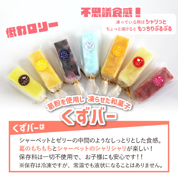 | 容量 | ・くずバー 8本セット ストロベリー・白桃・パイン・オレンジ・ブルーベリー・抹茶・チョコバナナ・安納芋・栗・りんご・ラムネ等 ※種類は選べません。 ※時期により、お届けする種類が変わる場合がございます。 |